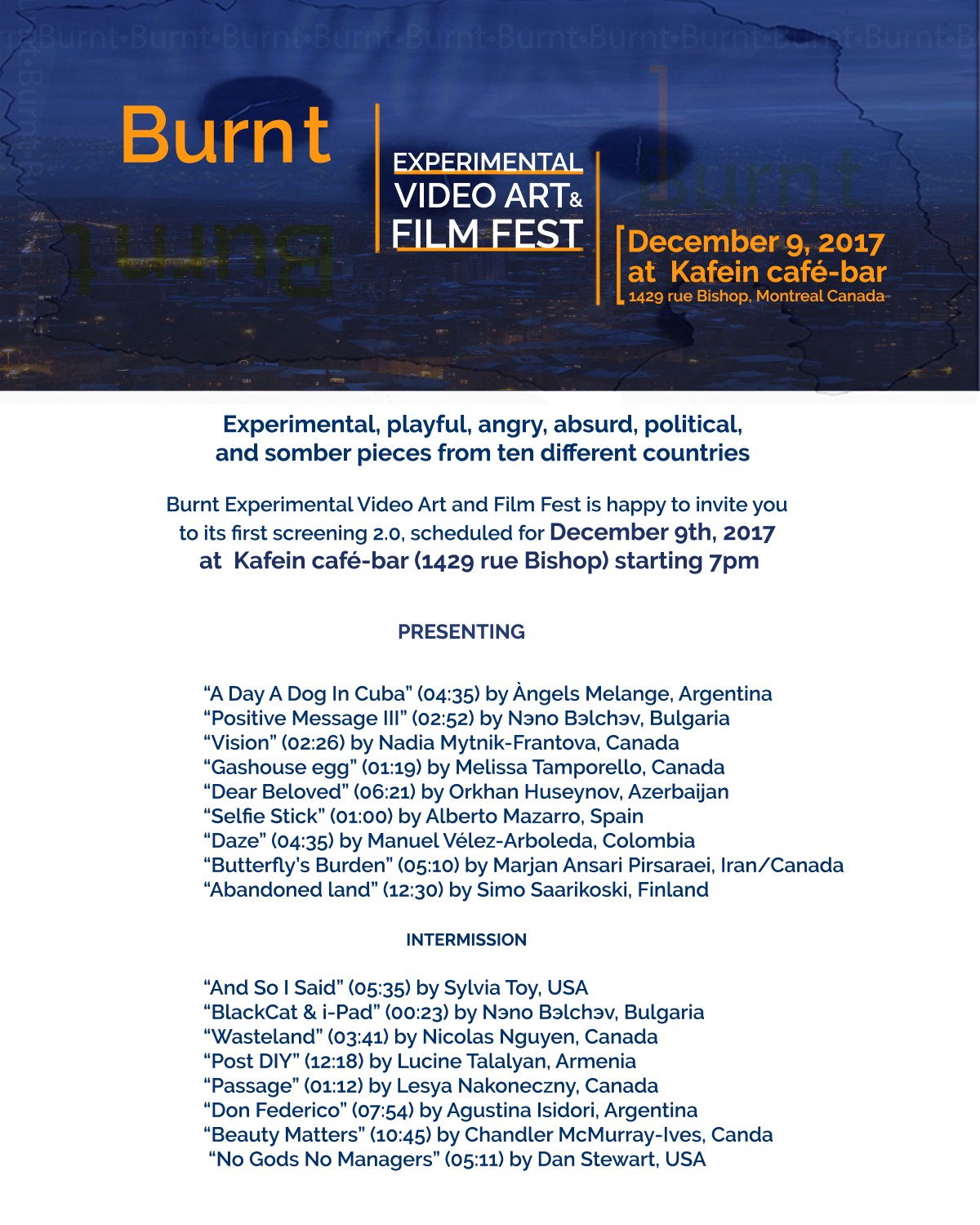 Burnt Experimental Video Art and Film Fest is currently accepting applications for it’s second edition! Deadline to submit: November 1st, 2018, midnight. We are looking to show radical experimental video art and film, whether abstract, absurd, comedic, critical, queer or uncanny. Applications are free and accepted through our website. Alternatively, artists can apply through FilmFreeway […]